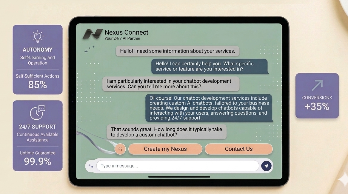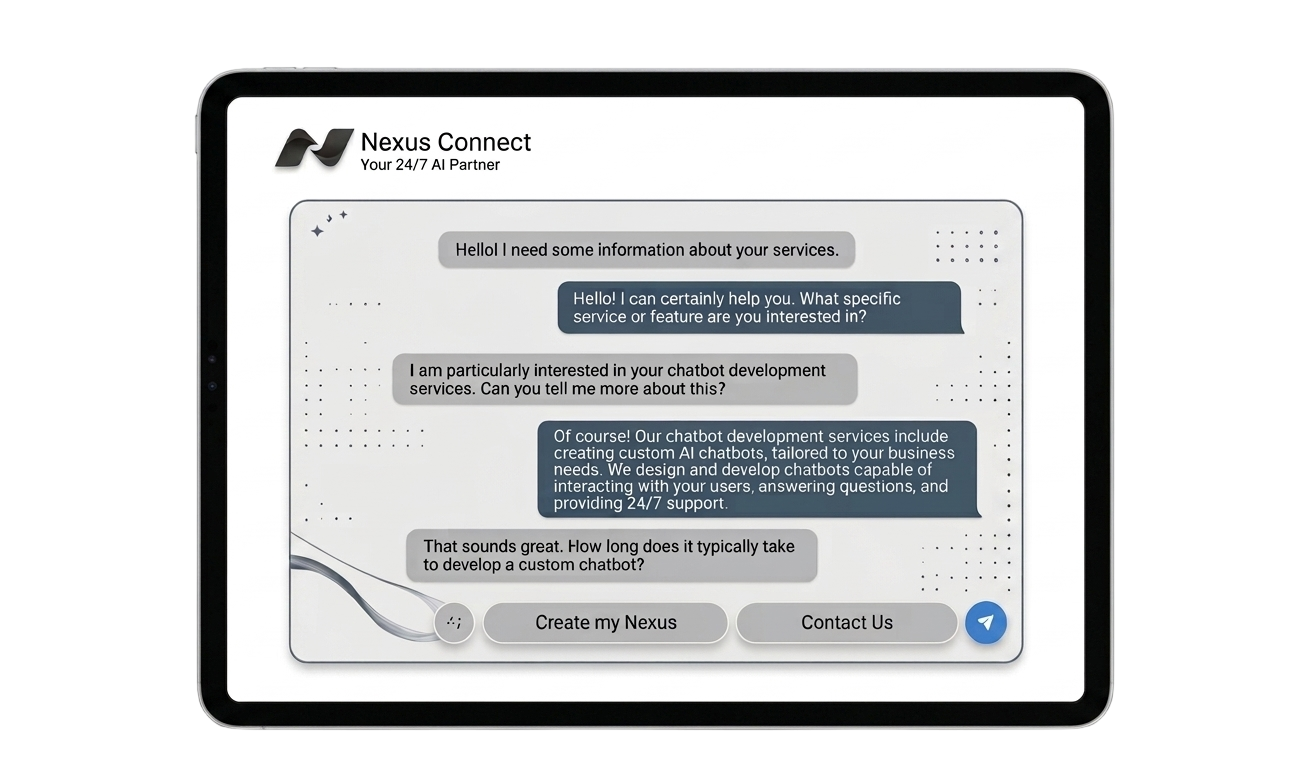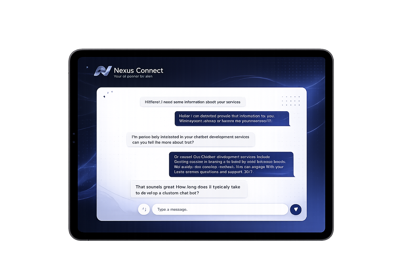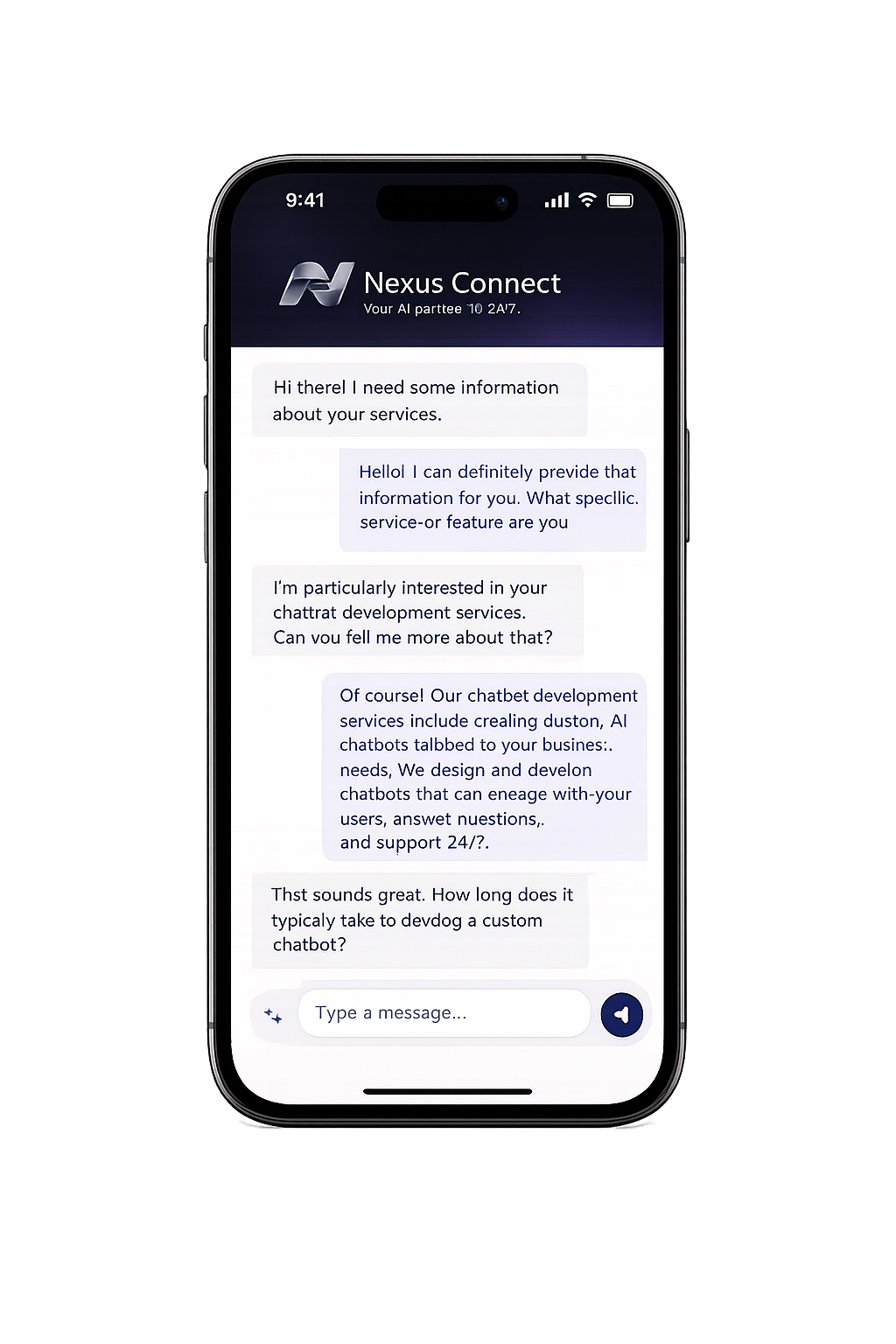 At NexusConnect, we integrate an AI-powered chatbot directly into your website to create a real interactive link between your business and your customers, improve the user experience in real time, answer questions instantly, and streamline interactions while strengthening visitor engagement and satisfaction.